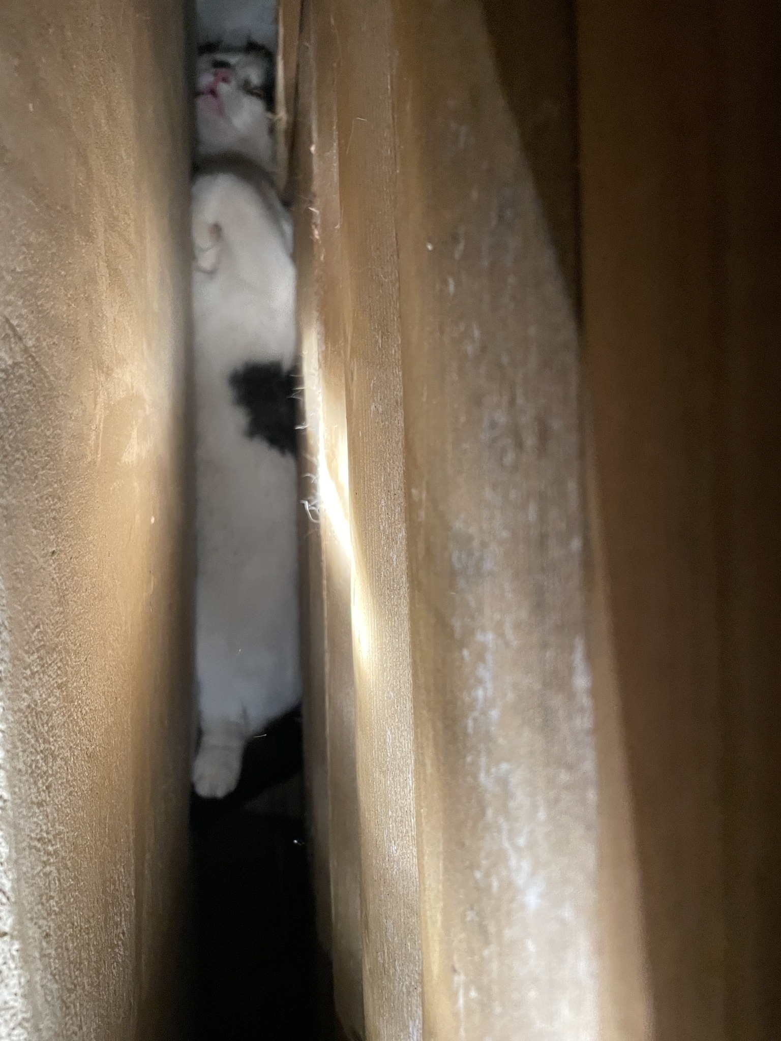 Eine Katze war in einen Spalt zwischen einer Gartenmauer und einer Gartenhütte gestürzt, kam am Rücken zu liegen und konnte sich nicht mehr selbst aus der Lage befreien. Nach Auskunft der Besitzerin war sie bereits seit zwei Tagen abgängig.