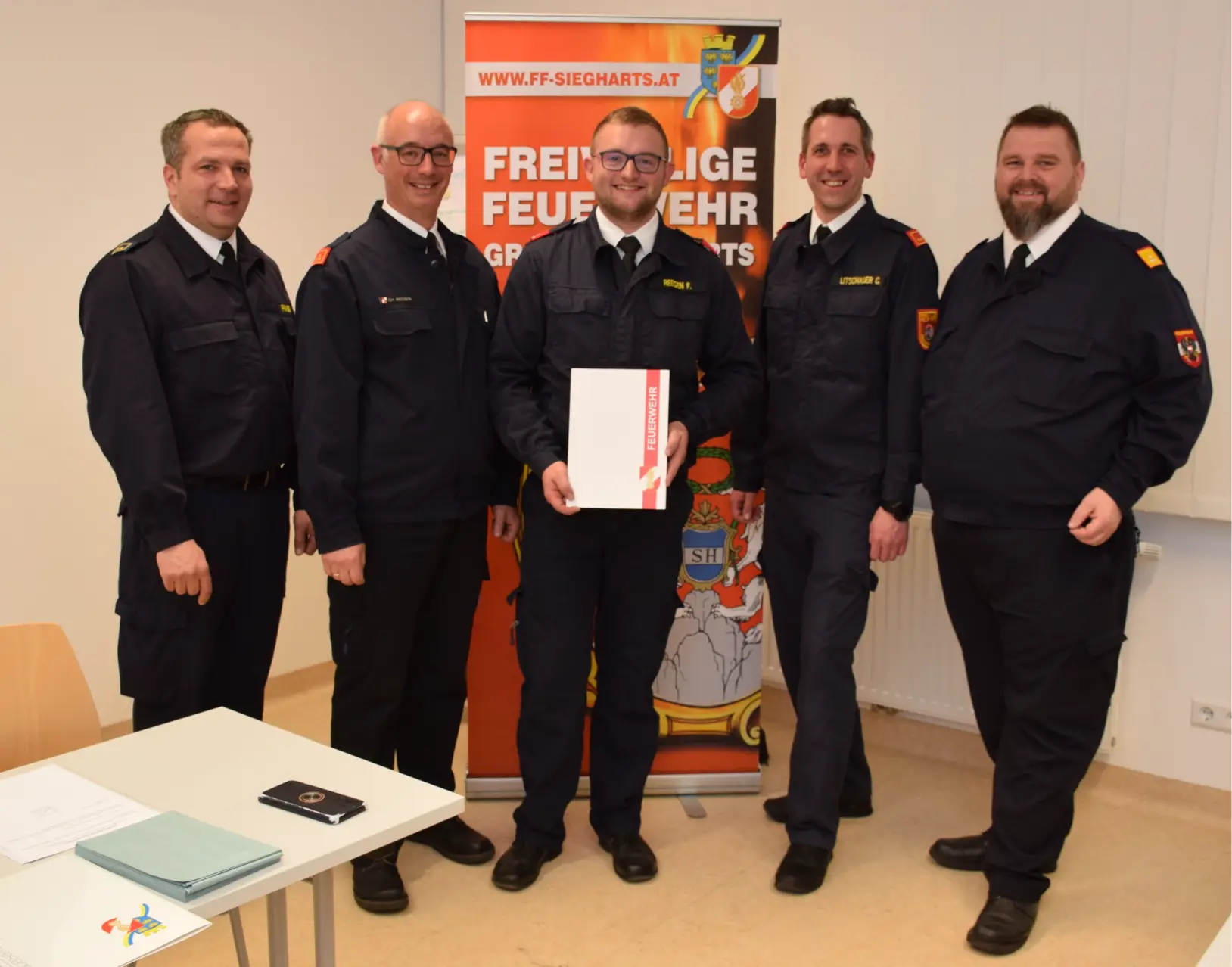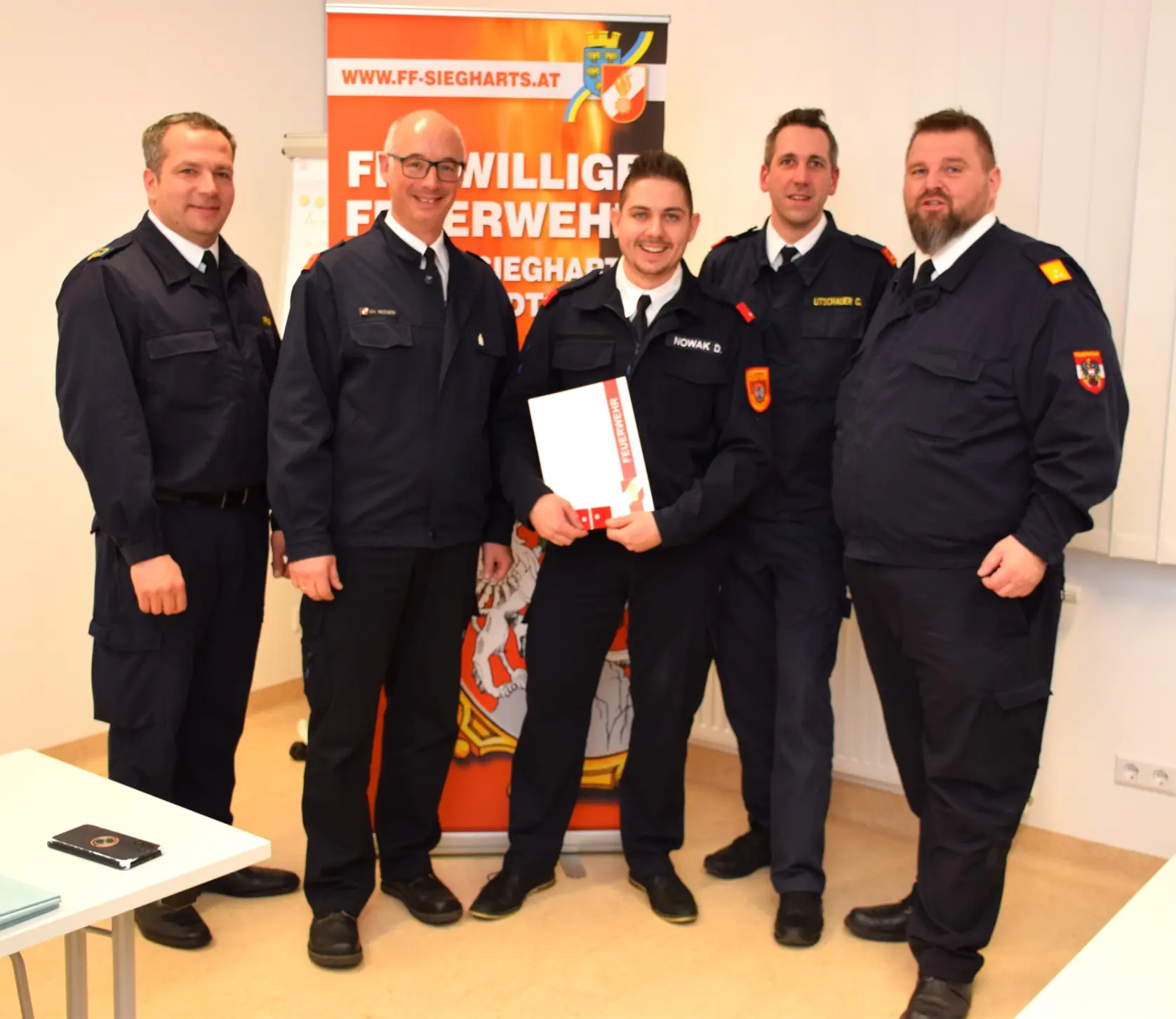 Die Mitglieder der Feuerwehr Groß-Siegharts-Stadt gratulieren Christoph Litschauer zur Wiederwahl und den beiden Mitgliedern zu den Beförderungen.
